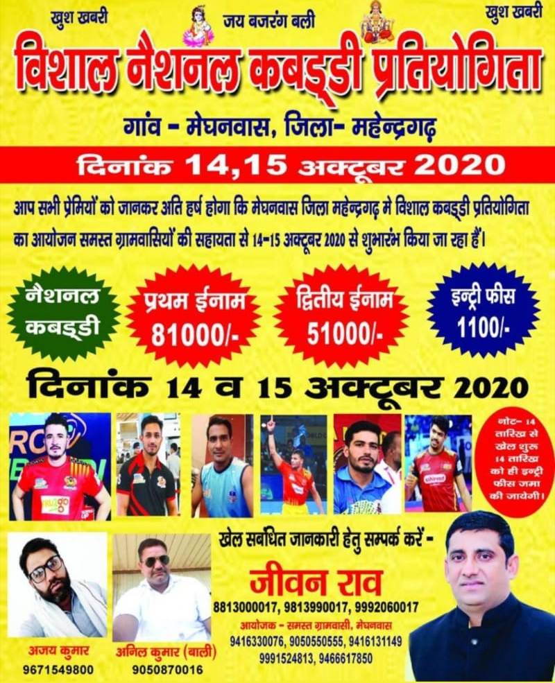 मागील अनेक महिन्यांपासून अन्य खेळांप्रमाणे कबड्डीचे सामने देखील स्थगित झाले होते. पण आता बाकी खेळांप्रमाणेच कबड्डीचे देखील पुनरागमन होत आहे. भारतातील हरियाणा राज्यातील महेंद्रगढ जिल्ह्याच्या मेघनवास गावात विशाल राष्ट्रीय कबड्डी स्पर्धा आयोजित करण्यात आली आहे. या स्पर्धेचे आयोजन गावातील लोकांच्या मदतीने करण्यात येत आहे.